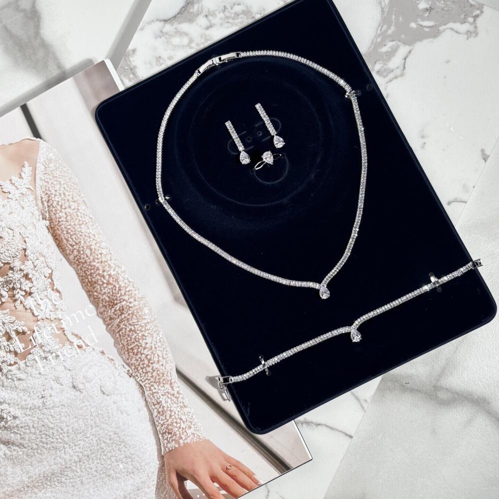 أضيئي يومك الخاص بأناقة لا تُضاهى مع هذا الطقم الملكي المصمم بعناية ليكمل إطلالتك كعروس متألقة. يتميز هذا الطقم الفاخر بتفاصيله الراقية التي تجمع بين الفخامة والرقة، ويشمل: