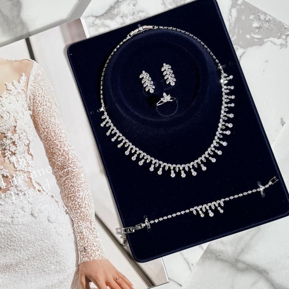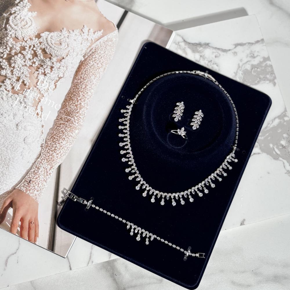 أضيئي يومك الخاص بأناقة لا تُضاهى مع هذا الطقم الملكي المصمم بعناية ليكمل إطلالتك كعروس متألقة. يتميز هذا الطقم الفاخر بتفاصيله الراقية التي تجمع بين الفخامة والرقة، ويشمل: