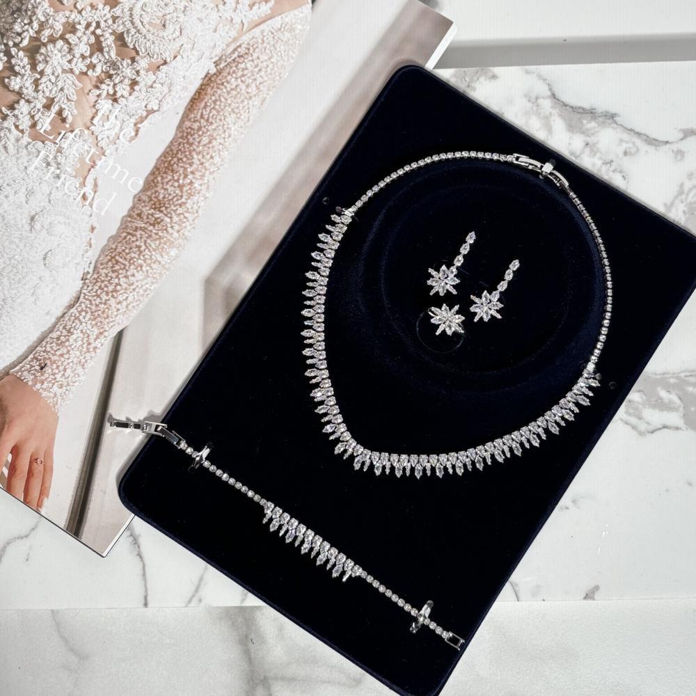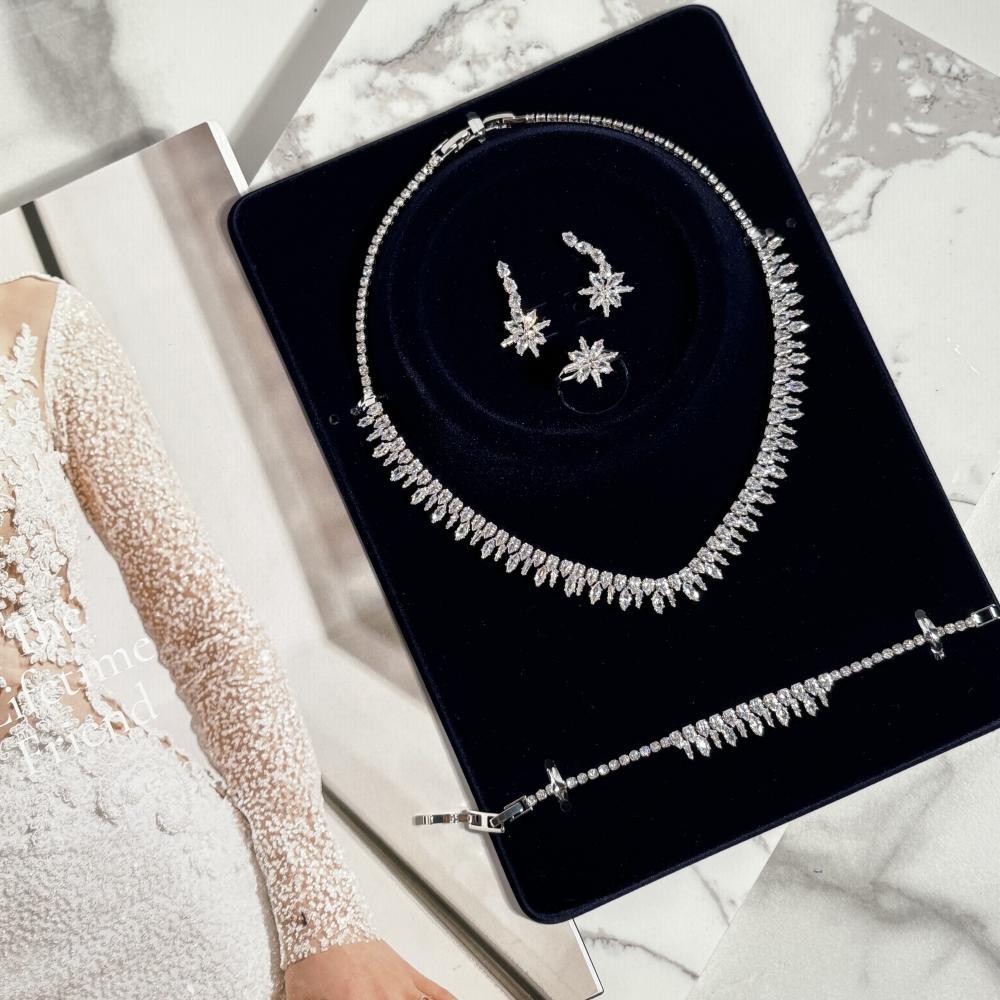 أضيئي يومك الخاص بأناقة لا تُضاهى مع هذا الطقم الملكي المصمم بعناية ليكمل إطلالتك كعروس متألقة. يتميز هذا الطقم الفاخر بتفاصيله الراقية التي تجمع بين الفخامة والرقة، ويشمل: